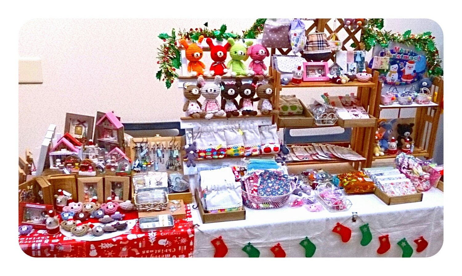 クリスマスものをメインに、ミニチュアやサンタくまの編みぐるみ、ブローチなど